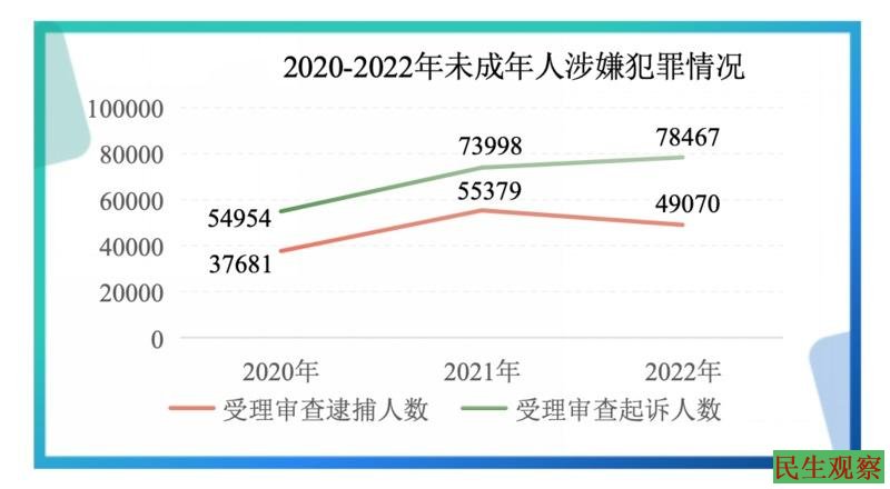再据中国青年报客户端北京2023年6月1日电,最高人民检察院当天发布《未成年人检察工作白皮书(2022)》(以下简称《白皮书》)显示,从2020年至2022年检察机关受理审查逮捕、审查起诉未成年犯罪嫌疑人数分别为37681人、55379人、49070人,受理审查起诉未成年犯罪嫌疑人数分别为54954人、73998人、78467人,总体呈上升趋势。