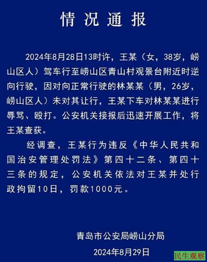 “逆行插队打人事件”发生于8月28日13时许。据青岛崂山区警方此前通报,38岁的女司机王某驾路虎车行至崂山区青山村观景台附近时逆向行驶,因对向正常行驶的26岁男司机林某某未对其让行,王某下车对林某某进行辱骂、殴打。