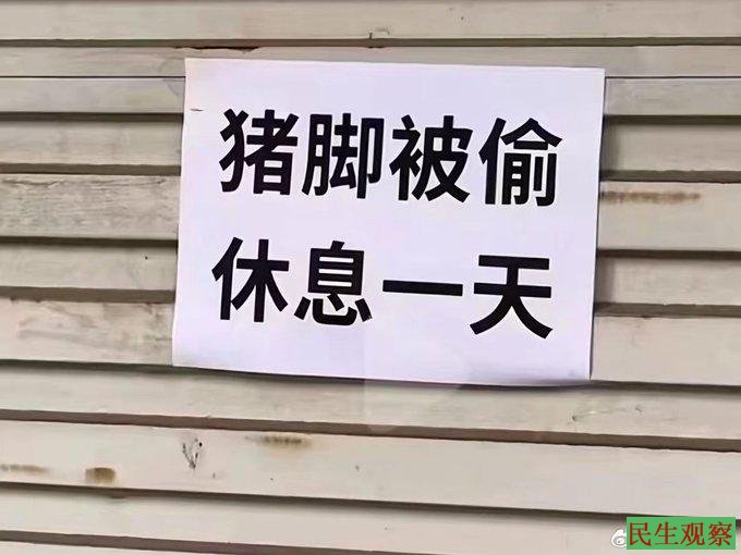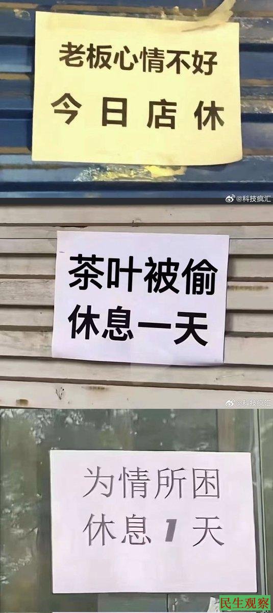从网友拍摄到的「休息一天」告示牌上理由包括「猪脚被偷」、「夫妻吵架,休息一天」、「没有哄好,再休一天」、「怕鬼」、「鱼被水淹死了」、「老板心情不好」、「茶叶被偷」、「为情所困」等,让网民们看啼笑皆非。