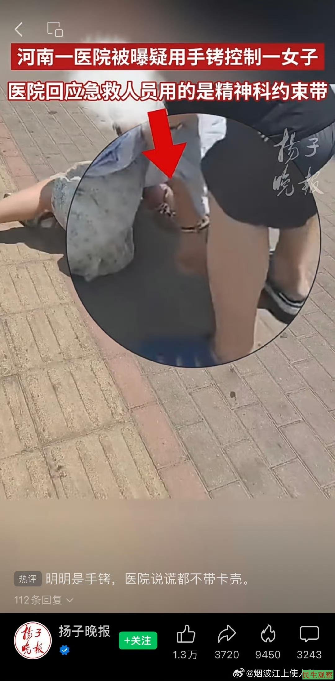 娱晴烟雨:河南禹州女子被医院强制带走治疗事件因医护人员疑似使用手铐在网络上掀起轩然大波。起初,面对汹涌的舆论,院方轻飘飘回应称使用的是精神科约束带,但视频中明晃晃的金属器械与大众认知里的约束带大相迳庭,直到官方通报承认医护人员采取了不当的约束措施,却依旧对是否使用手铐这一关键问题避重就轻。