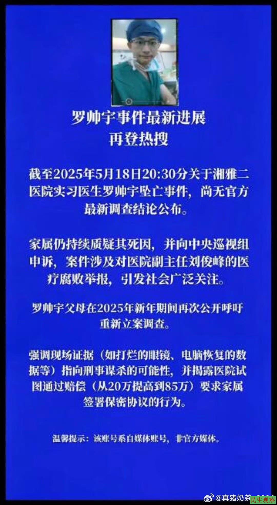 家属维权与社会声援:罗帅宇父母持续在社交媒体发声,并携带举报材料寻求上级部门调查,但事件长期未获官方立案。其母在2025年5月(事件一周年)公开表示曾向巡视组反映情况,引发短暂关注。部分网民及大V账号(如@我的队友四条狗丶RE)指出,罗帅宇可能因举报黑幕遭报复,呼吁公众关注医疗系统腐败问题。