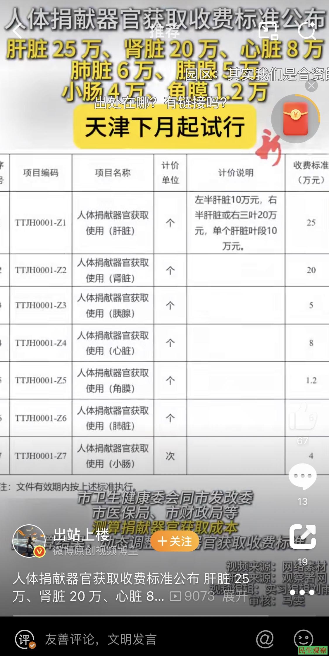 天津2025年试行标准,人体捐献器官获取收费标准公布肝脏25万、肾脏20万、心脏8万、肺脏6万、胰腺5万、小肠4万、角膜1.2万天津下月起试行。
