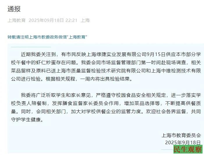 9月15日,上海普陀、徐汇、闵行等多区学校午餐中的“虾仁炒蛋”被学生反映散发刺鼻腐臭味,部分学生食用后呕吐,校方紧急撤菜。此套餐由上海绿捷实业发展有限公司提供。绿捷垄断了上海30%的学生餐,覆盖500多所学校,日供餐超50万份。该公司曾多次因生命权、健康权、身体权纠纷被起诉。学校强制学生填“满意”问卷,12345投诉未获整改。引发了社会的广泛关注。网民对事件的本质反思:当50万份需求被单一企业垄断,监管停留在“撤菜灭火”而非源头防控,学生的健康便成了压缩成本的牺牲品,这背后的成本压缩让人细思极恐。此次事件撕开校园餐利益链的遮羞布——唯有打破垄断黑箱,才能终结“臭虾仁”式悲剧。