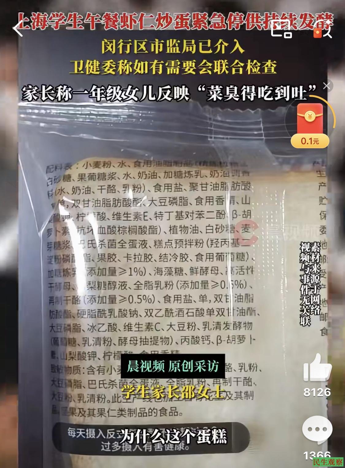潇湘晨报:上海发生“虾仁炒蛋”事件后,家长感到非常的揪心,因为自己的女儿在学校吃的饭菜,是由同一个供应商提供的,她担心女儿在用餐过程中是否会遇到同样的问题。学校将配餐里的小面包,家长拍到的照片显示,这个小面包的配料表非常复杂,其中包含了大量的添加剂。“里面有精炼植物油、白砂糖、各种香精,感觉就很不干净。”另外一名学生家长表示,孩子反映了学校配餐没有营养,不好吃的问题,配餐中有很多的油炸食品,还有一些速冻的鸡鸭肉。“我们做家长的,只希望孩子在学校能吃上一顿安心、健康、温暖的午饭,不要再拿不新鲜、不健康的东西糊弄我们的孩子了。”家长表示按往年惯例,餐费可能在每餐15元或者18元。