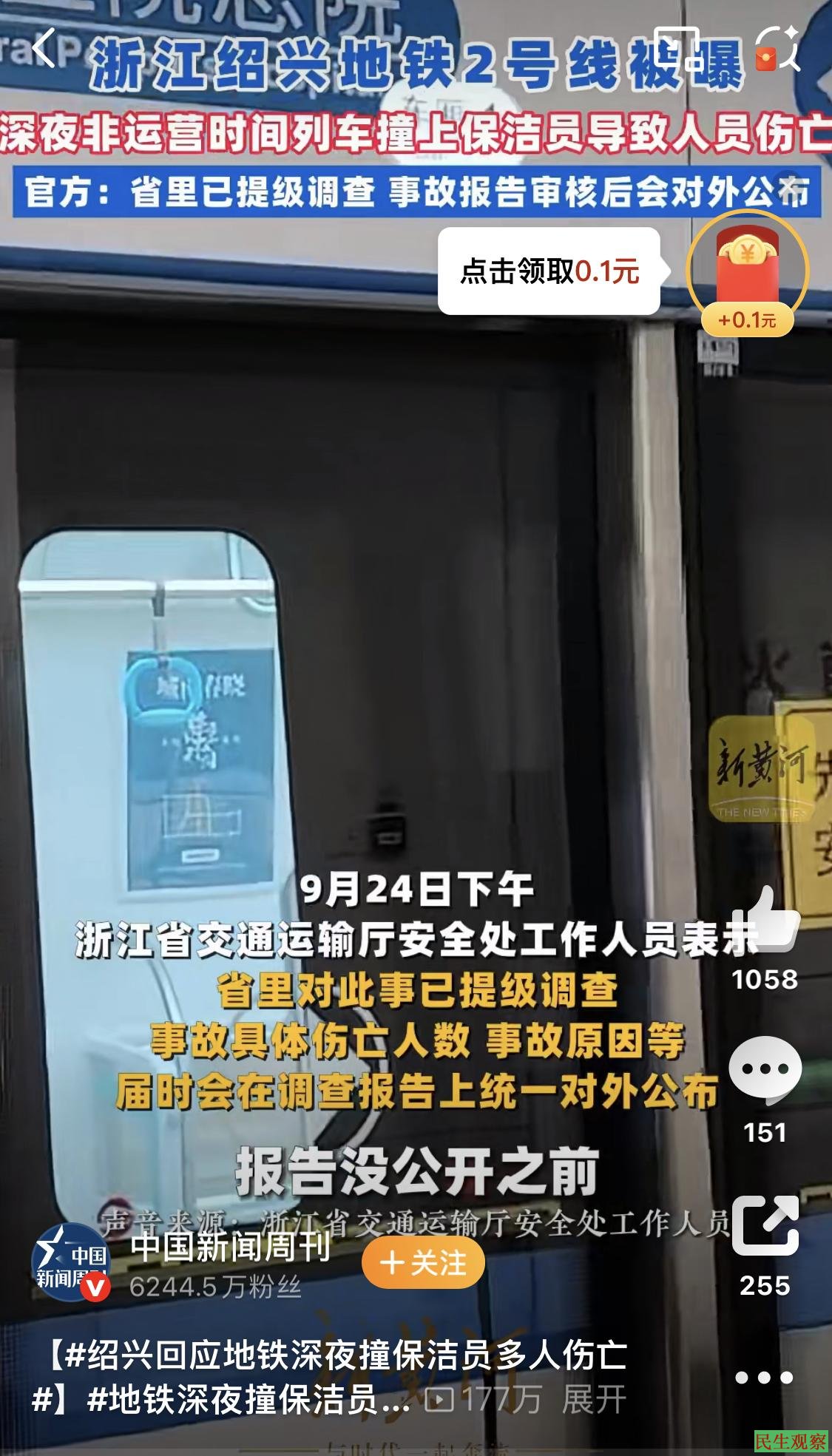 绍兴地铁深夜撞保洁员致多人伤亡未公开披露 |
