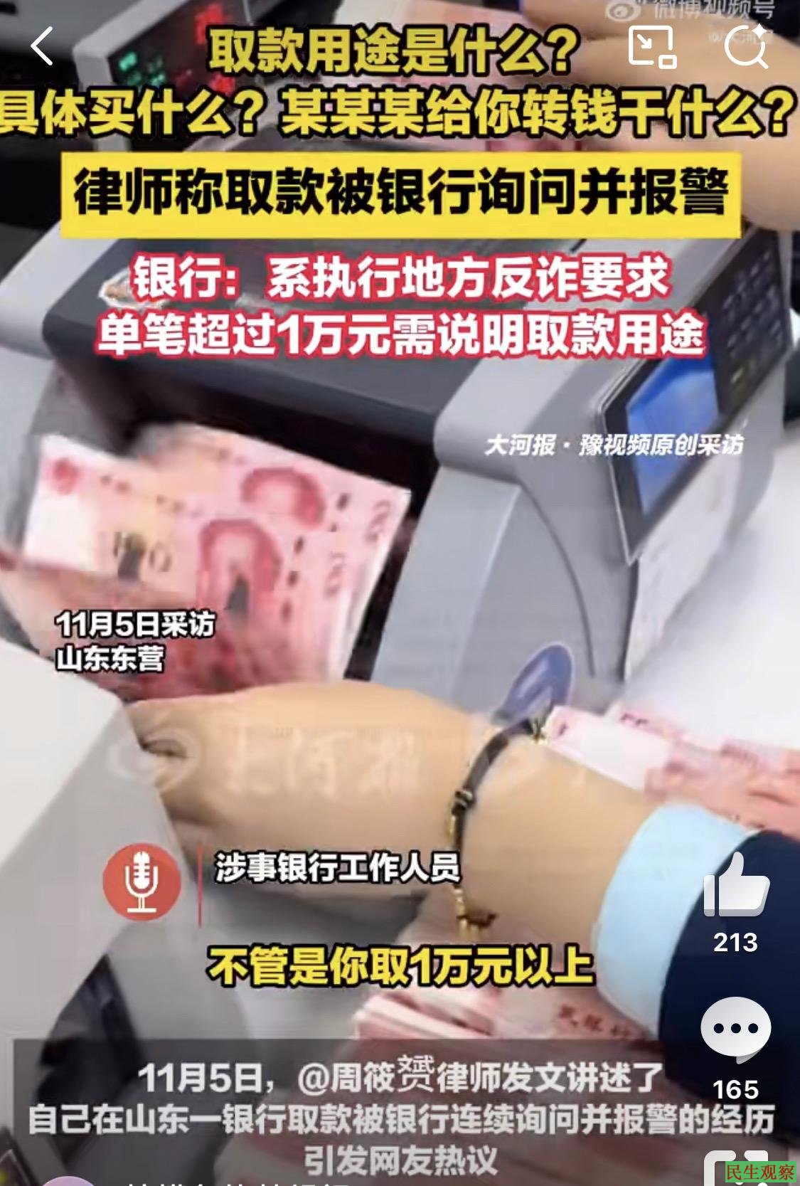 空天砺剑:感觉更大的问题在银行身上,按照东营市反诈中心的说法是根据现在的反诈形势才有这样的要求,但对于取现金的数额没有标准,其实有这样的要求可以理解,毕竟诈骗事件依然高发;而中国建设银行东营东城支行给的说法是不管取现1万以上,还是5万以上,都需要提供说明用途和资金来源,而银行是不能阻碍用户办理相关业务的,中国建设银行东营东城分行有些为难人了。