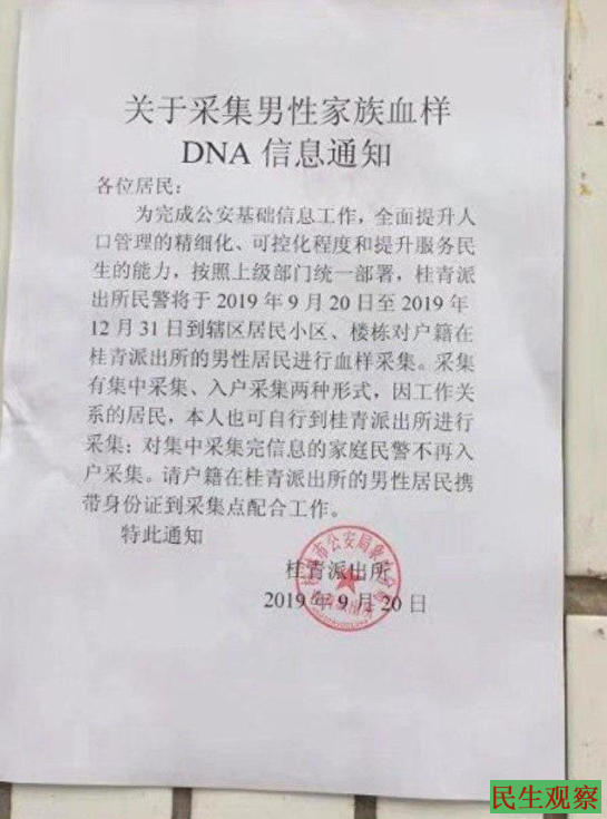 桂林市桂青派出所9月20日发出的通知显示,称为按照“上级部门统一部署”,该所将于2019年9月20日至12月31日到辖区居民小区,对户籍在该所辖区的男性居民进行血样采集。采集有集中采集、入户采集两种方式。并称目的是“为完成公安基础信息工作”,“提升人口管理的精细化,可控化程度”。