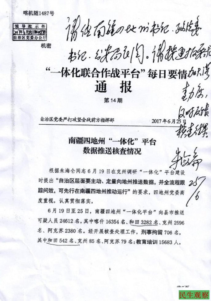 国际调查记者同盟公布的中国政府机密文件透露了新疆政府如何运用“一体化联合作战平台”的细节。其中第14期通报内容显示政府如何根据该平台所产生的可疑人士名单来进行调查与关押。通报内容显示,新疆政府在2017年6月一周内根据一体化平台产生的可疑人士名单,就把15683个人关进了再教育营内,此外还有706人被正式逮捕。