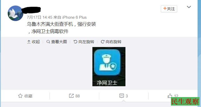 新疆民众的电脑手机被强制安装净网卫士后,相当于电子手铐。不但使用者本人被监控,网警还会根据传送的信息监控所有与使用者相关的人。这一技术更可轻而易举推广至整个中国或其他专制环境。