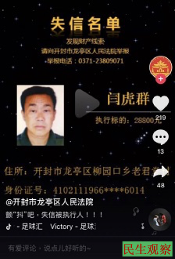 开封龙亭法院将失信人照片植入“抖音”中
