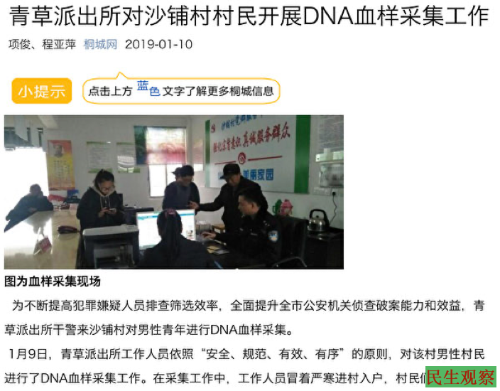 2019年1月,安徽的桐城网报导,安徽安庆市桐城市青草镇派出所到沙铺村对男性青年进行DNA血样采集。青草镇政法委员鲁永进全程陪同。