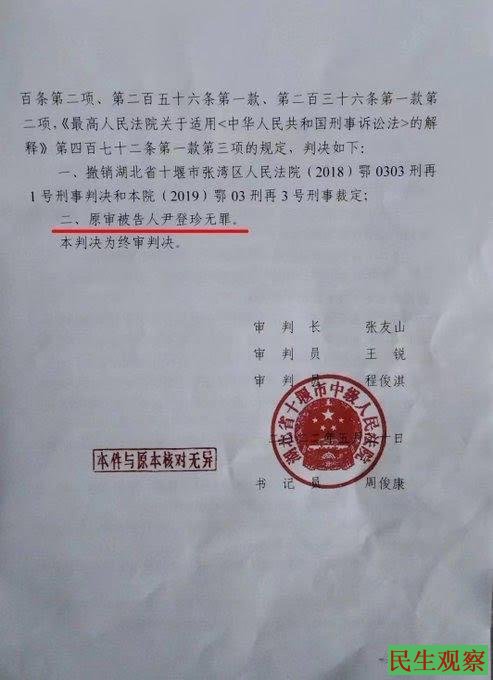 后因民事官司执行不到位,2006年尹登珍开始上访维权,2007年被劳教1年3个月,2009年被市政府、公检法集体做假证捏造冤案“敲诈勒索政府罪”判刑服刑3年,该案通过尹登珍上诉申诉16次,最终于2022年5月30日其“敲诈勒索政府罪”被宣告无罪。