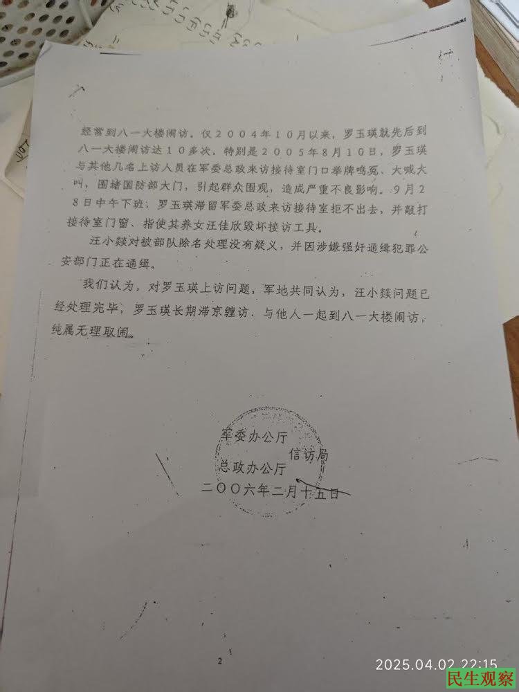 2023年12月4日罗玉英曾通过视频说:“我的儿子叫汪小燚,1999年在湖北广水入伍,是95829部队的空降兵,我儿子在部队里被军官非法体罚虐待,毒打致残,小便出血,精神受到刺激,部队欺骗我们父母,把孩子档案交给我们了,然后买通我们南部县的女县长祝琳(音)、武装部政委冯祥全、信访局局长张黎明,背着我们搞公证,搞信访终结,部队逃脱法律责任,地方不负法律责任,造成我们上访22年。