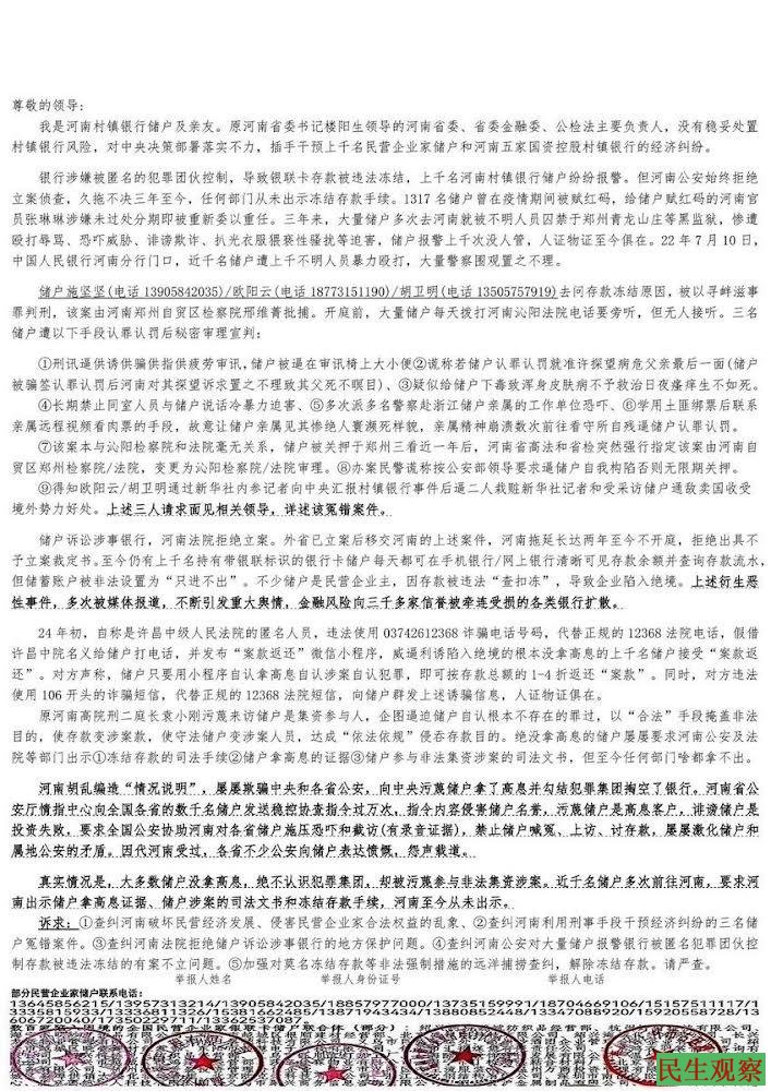 诉求:①查纠河南破坏民营经济发展、侵害民营企业家合法权益的乱象、②查纠河南利用刑事手段干预经济纠纷的三名储户冤错案件。③查纠河南法院拒绝储户诉讼涉事银行的地方保护问题。④查纠河南公安对大量储户报警银行被匿名犯罪团伙控制存款被违法冻结的有案不立问题。⑤加强对莫名冻结存救等非法强制措施的远洋捕捞查纠,解除冻结存款。请严查。