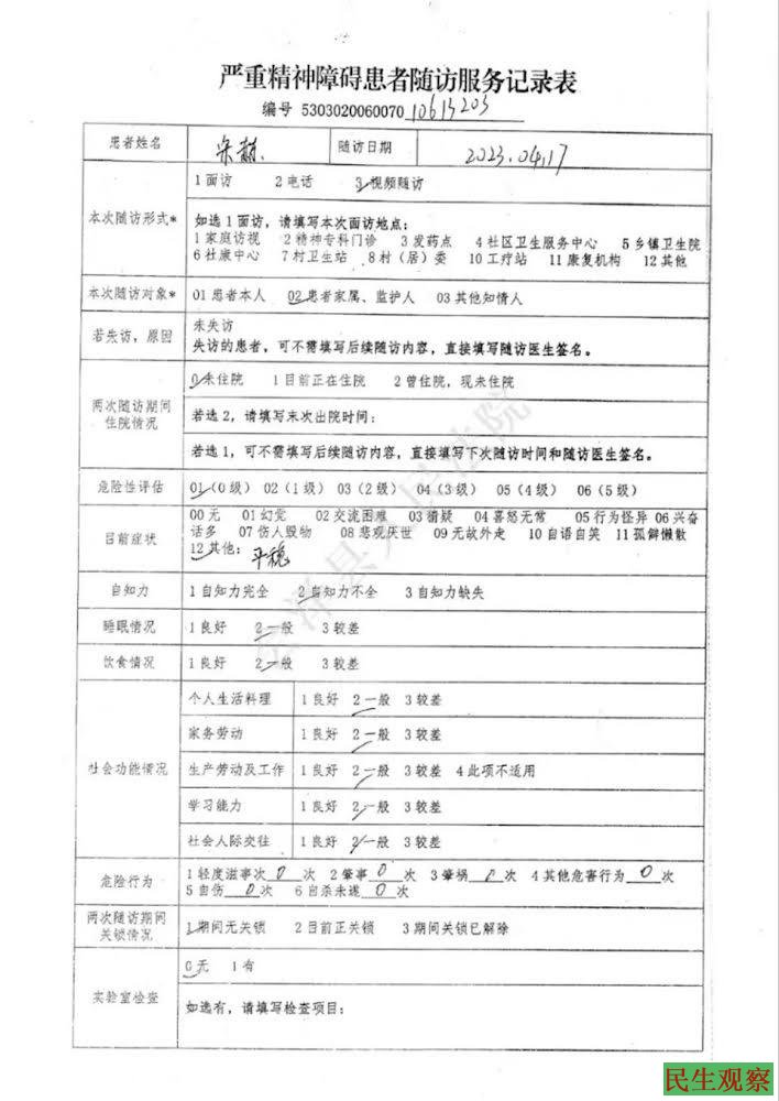这些记录标注的医生随访方式多为视频随访,宋赫的症状显示为(产生)幻觉、猜疑、喜怒无常、交流困难、行为怪异、悲观厌世、孤僻懒散等多种形式。但宋赫称自己从未接到过会泽县人民医院或纸厂卫生院医生的电话和视频要求,不知道他们是如何进行随访的。