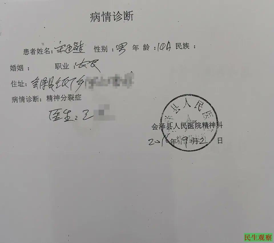 后经多方了解才得知,原来在2016年9月2日,正在上初一的宋赫被会泽县人民医院精神科医生王某诊断为精神分裂症,且纳入了当地重性精神疾病管理治疗网络。