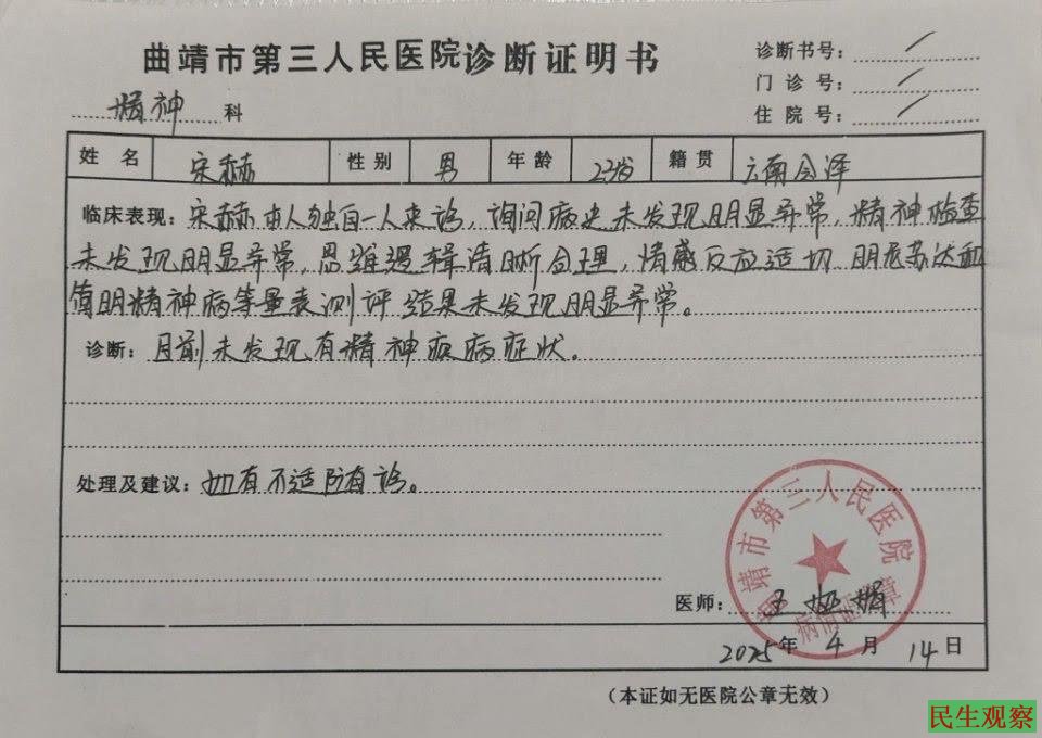 曲靖市第三人民医院精神科于2025年4月出具的诊断证明书显示,宋赫精神检查未发现明显异常,思维逻辑清晰合理,情感反应适切……目前未发现有精神疾病症状。