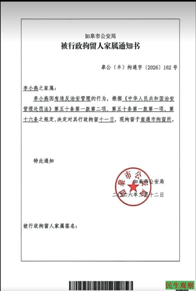 2026年2月12日,李小燕家属收到行政拘留通知书,显示李小燕因有违反治安管理的行为,根据《中华人民共和国治安管理处罚法》第五十条第一款第二项、第五十条第一款第一项、第十六条之规定,决定对其行政拘留十一日,现拘留于南通市拘留所。